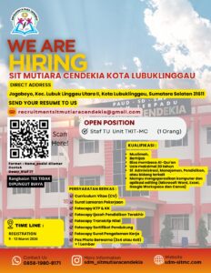 📢 LOWONGAN PEKERJAAN TKIT Mutiara Cendekia Kota Lubuklinggau Sekolah Islam Terpadu (SIT) Mutiara Cendekia Kota Lubuklinggau membuka kesempatan bagi Anda yang berkompeten dan berdedikasi untuk